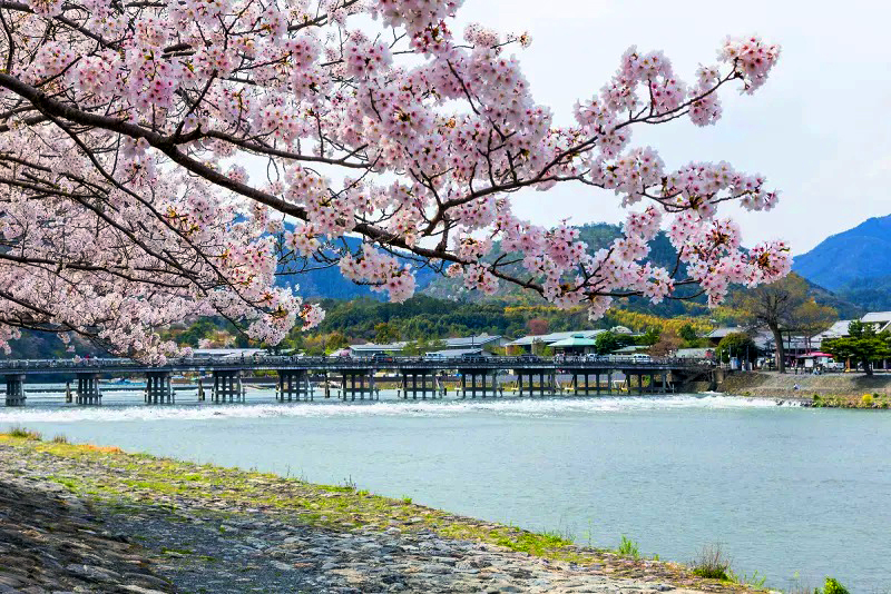 - Ngắm lá hoa anh đào tại khu vực Arashiyama – Cầu Togetsukyo nơi có sông Hozu thơ mộng chảy qua tạo nên khung cảnh tuyệt đẹp mùa hoa anh đào.