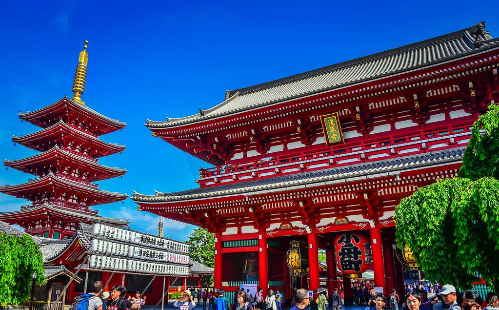 - Đền Asakusa Kannon: còn được biết đến với tên gọi là Sensoji. Senso là một cách gọi khác của Asakusa, còn “ji” tiếng Nhật có nghĩa là đền, chùa. Sensoji là ngôi đền cổ xưa nhất không những của Asakusa, mà là của cả thành phố Tokyo. Đền được xây dựng hoàn chỉnh vào năm 645. Đây là ngôi chùa cổ to nhất Tokyo và cũng nổi tiếng là đền thờ Phật Quan Âm linh thiêng nhất, được người dân Nhật thường xuyên tới để cầu nguyện và khấn Phật. Ngôi chùa năm cạnh dòng sông Sumida cổ kính thơ mộng và hiền hòa. Khi đến chùa, du khách phải đi qua Cổng Kaminarimon – Thunder Gate, biểu tượng của Chùa Asakusa và cũng là của thành phố Tokyo. Nơi treo ngọn đèn lồng khổng lồ màu đỏ có chiều cao 4m, chu vi 3m, nặng khoảng 670 kg, 10 năm mới được thay mới một lần.