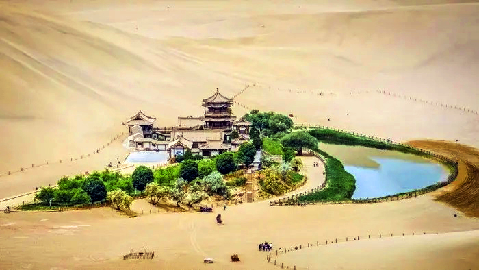 • Nguyệt Nha Tuyền (hay Hồ Bán Nguyệt) tồn tại ít nhất 2000 năm, một trong tám cảnh đẹp của Đôn Hoàng nhưng đang dần biến mất do sự phát triển quá mức của nông nghiệp. Ốc đảo này nổi tiếng với một bề dày văn hóa khá lâu đời: đây là điểm dừng chân không thể bỏ qua của các thương nhân Ả Rập trên Con Đường Tơ Lụa huyền thoại. Đồng thời, nó cũng nằm trên tuyến hành trình về với cõi Phật của các tín đồ Phật giáo từ khắp nơi.Với người Trung Hoa cổ đại, ốc đảo này được mệnh danh là cửa ngõ phía Tây của Trung Quốc. Đến đây, du khách sẽ có dịp chiêm ngưỡng vẻ đẹp của những công trình kiến trúc mang đặc trưng phong kiến xưa, không khác gì một cung điện giữa sa mạc hoang vu. Dọc theo bờ hồ Nguyệt Nha Tuyền là một ngôi chùa mang kiến trúc truyền thống Trung Hoa, được xây dựng từ thời nhà Hán.