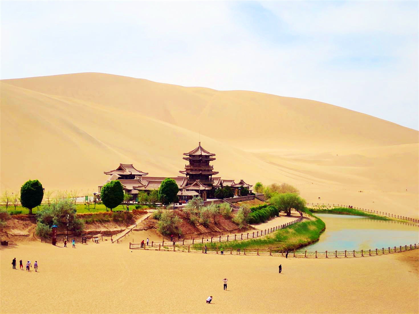 • Nguyệt Nha Tuyền (hay Hồ Bán Nguyệt) tồn tại ít nhất 2000 năm, một trong tám cảnh đẹp của Đôn Hoàng nhưng đang dần biến mất do sự phát triển quá mức của nông nghiệp. Ốc đảo này nổi tiếng với một bề dày văn hóa khá lâu đời: đây là điểm dừng chân không thể bỏ qua của các thương nhân Ả Rập trên Con Đường Tơ Lụa huyền thoại. Đồng thời, nó cũng nằm trên tuyến hành trình về với cõi Phật của các tín đồ Phật giáo từ khắp nơi.Với người Trung Hoa cổ đại, ốc đảo này được mệnh danh là cửa ngõ phía Tây của Trung Quốc. Đến đây, du khách sẽ có dịp chiêm ngưỡng vẻ đẹp của những công trình kiến trúc mang đặc trưng phong kiến xưa, không khác gì một cung điện giữa sa mạc hoang vu. Dọc theo bờ hồ Nguyệt Nha Tuyền là một ngôi chùa mang kiến trúc truyền thống Trung Hoa, được xây dựng từ thời nhà Hán.